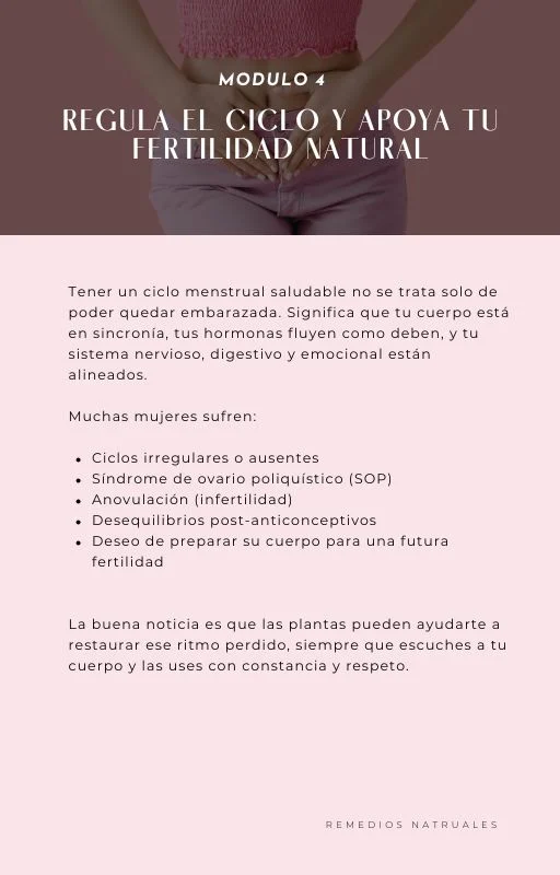 Este es un recurso que puedes usar mes tras mes, para reconectar contigo, regular tu ciclo y sanar desde lo natural. No es una moda. Es volver a ti.